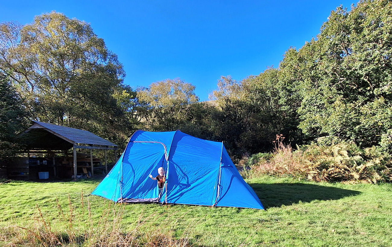 Pitch your tent by the sheltered firepit by a brook as well as as a covered cooking and picnic area by the tent. Please note there is no vehicular access. Access by grass paths. Short walk to the toilet block, posh compost toilet and lodge which are available all year round, this winter season we plan to have running water until the 3rd November 2024.